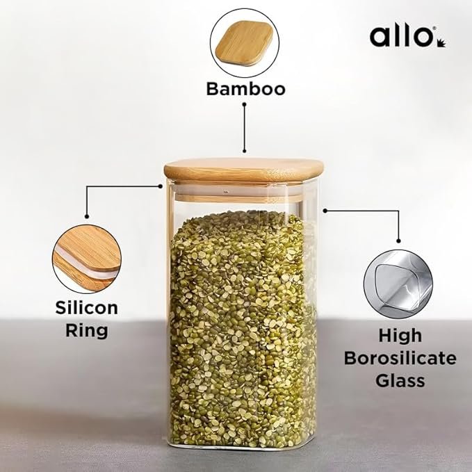 Allo 600ML Kitchen Storage Box Glass Jars With Wooden Lids – Borosilicate Glass Food Storage Containers Airtight Glass Jar For Tea, Coffee, Spice, Pulses, Masala (Square Glass Jar – Set of 3)