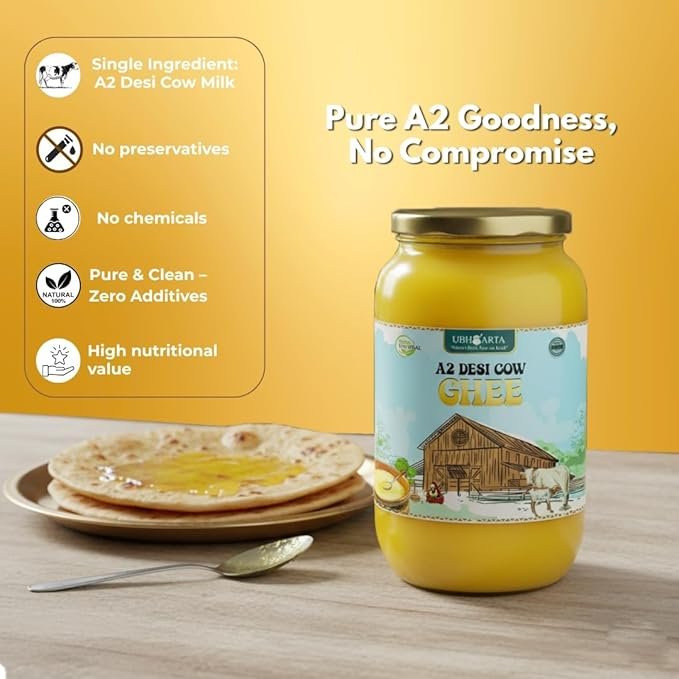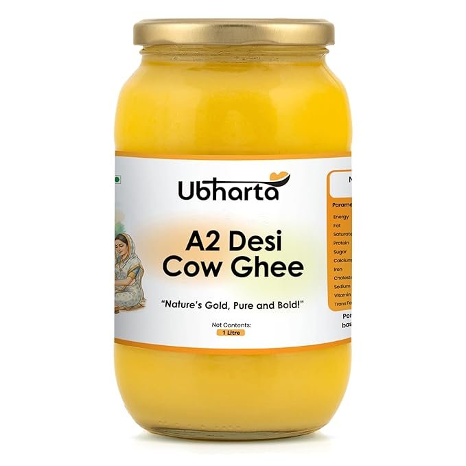 Ubharta A2 Desi Cow Ghee (1 Litre) | Traditional Bilona Method | Grassfed Hand-Churned Ghee | Pure & Healthy, Firewood-Cooked Indian A2 Desi Cow Ghee